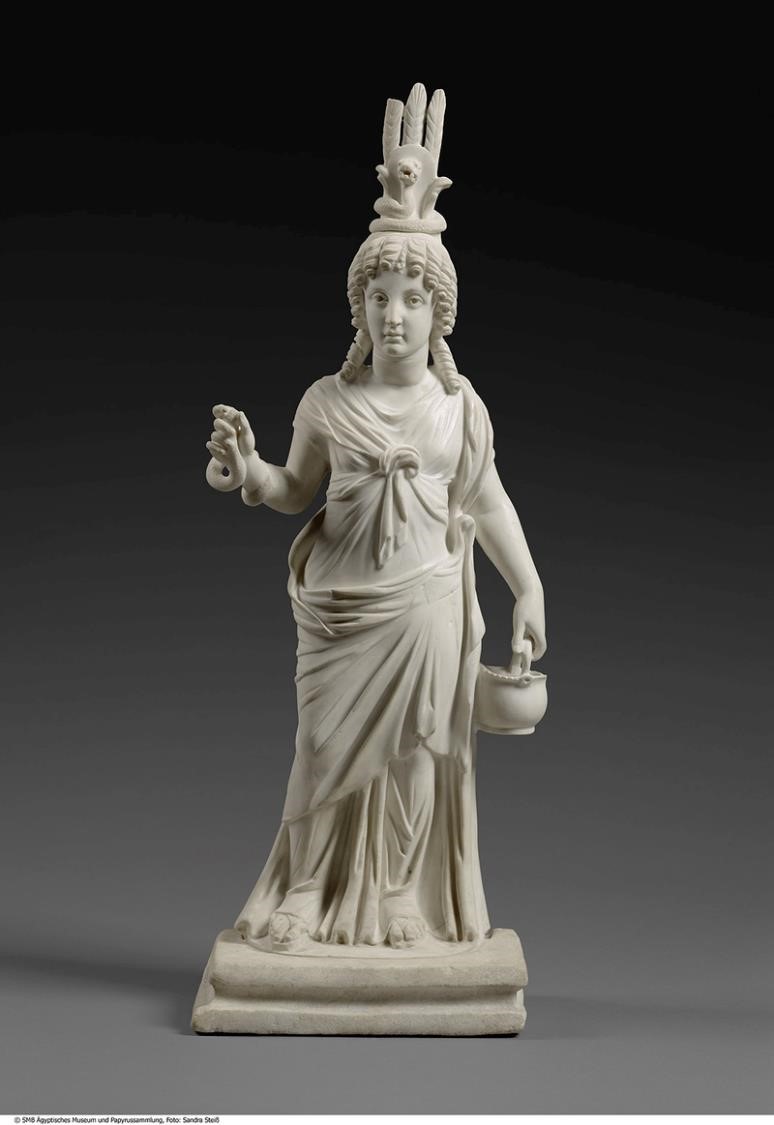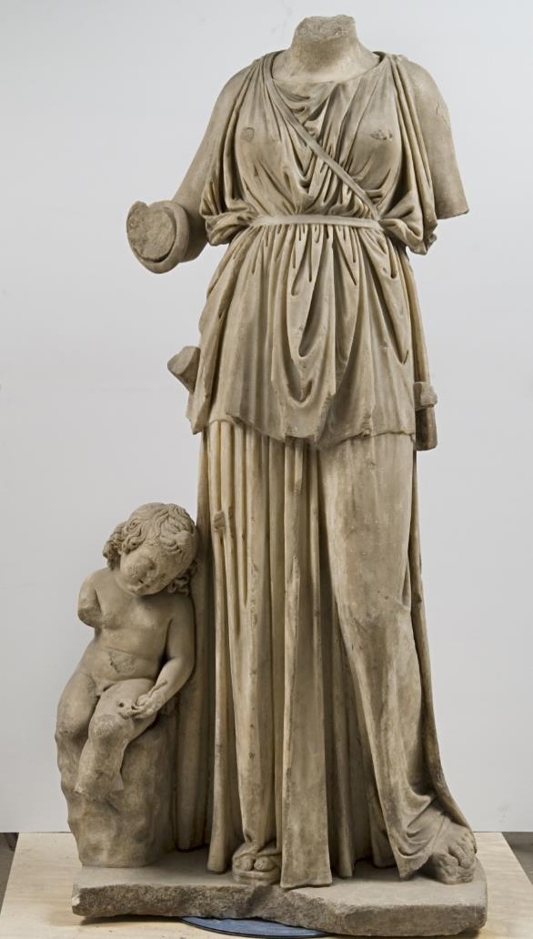 Le Musée royal de Mariemont conserve une remarquable collection de sculptures gréco-romaines, parmi lesquelles figure une statue en marbre associée à la sphère isiaque depuis son acquisition. Initialement conservée au Palazzo Sciarra à Rome à la fin du XIXᵉ siècle, cette œuvre passa ensuite par la collection Somzée à Bruxelles avant d’être acquise en 1904 par Raoul Warocqué, fondateur des collections de Mariemont. Plusieurs savants ont reconnu dans ce groupe statuaire une représentation polymorphe de la déesse Isis tenant une corne d’abondance et un serpent, accompagnée de son enfant Harpocrate.